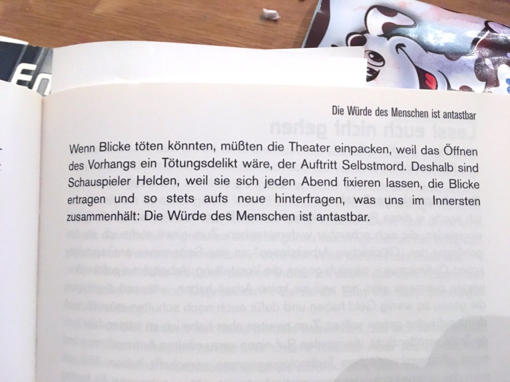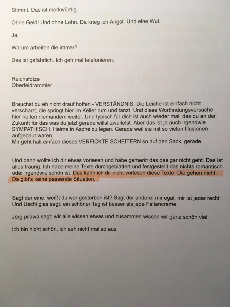An Claudia Karpfinger und Katharina Schmidt dafür dass sie den ehemaligen Puff zu einer burgeoisen Tanzlandschaft verwandelt haben und die Kostümierung der dortigen Gesellschaft, Tine Hagemann für den hinreißenden Hamsterkopf, Neil Vaggers für die großartige Musik, Verena Richter für textliche Kulturverteilwirrungen und saxophonistische sowie perkussive Höchstleistung, Laura Mangels dem dramaturgischen Gehirn, Jo Hübner für das famose Lichtdesign, Ilaria Grillo meiner Assistentin und Jakob Egenrieder für Handkamera und die zuverlässig knatternde Dicke Doris. Max und Bogdan für Abendtechnik, Basteleien, virtuose Technikorganisation und maximalcharmantes Mundharmonikaspiel. Andreas Seyferth und Margrit Carls für die Möglichkeit. Und den wahnsinnigen Sieben: Rainer Haustein (schwersttraumatisiert hinterlassen – sorry lieber Rainer) Melda Hazirci (das ist kein Scherz, das ist ein Leiden!) Peter Papakostidis (morgen reparierst du den Spiegelschrank!) Verena Richter (mit Faden!) Sarah Schuchardt (Aaaahhhhrg!), Neil Vaggers (so ein Vogelschiss!) und Alexander Wagner (der uns leider frühzeitig verlassen musste – gute Besserung!) – ihr seid/wart ein wunderbares Ensemble. Vielen Dank für eure Geduld und kreative Energie. Ihr alle habt diese meine erste größere Regiearbeit möglich und ausgemacht. Danke.
