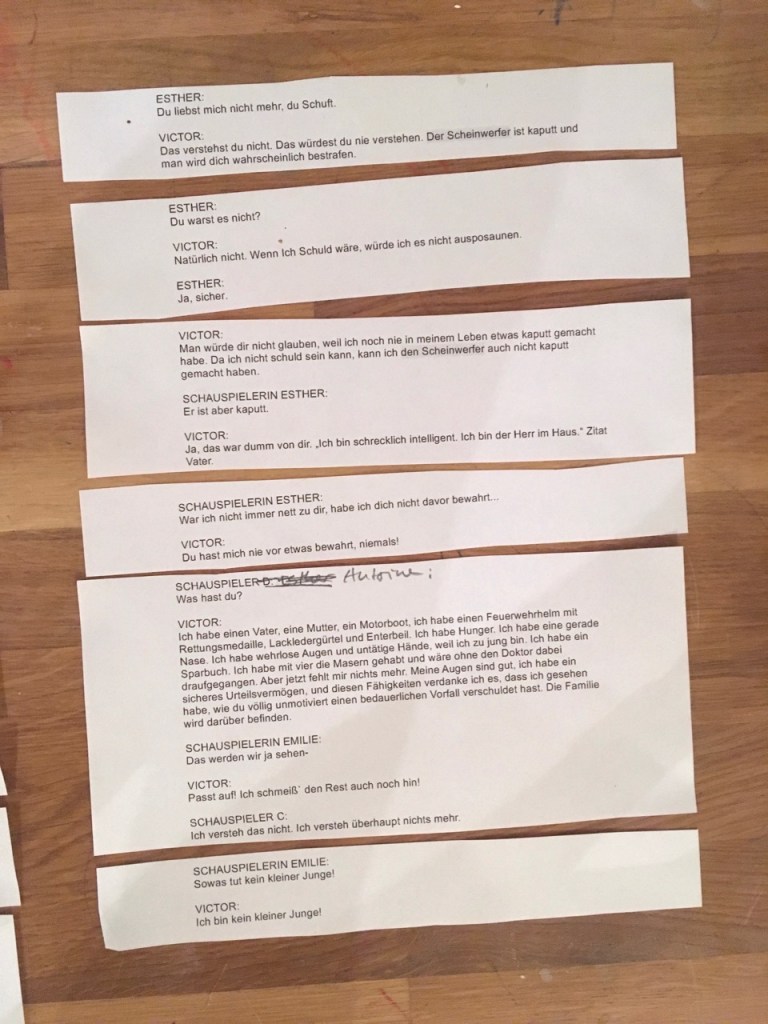 Gleichzeitig wollten wir einen Raum kreieren, der Situationen, die in dem Stück vorkommen, ermöglicht. Wir entschieden uns für eine Bühne, in der durch Höhenunterschiede eigene kleine Räume entstehen – jedoch ohne den Bezug zueinander verlieren. Während Victor beginnt, seine Eltern herauszufordern, befinden sich alle Figuren stets im selben Raum und doch an unterschiedlichen Orten.
