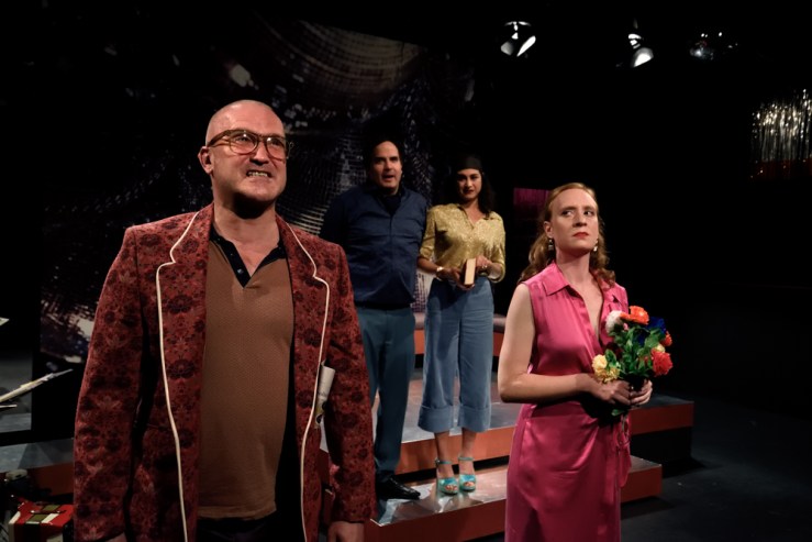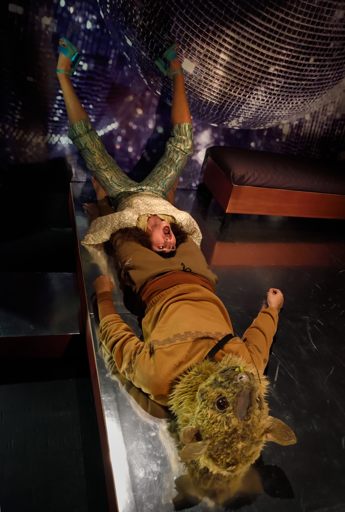 Beim gemeinsamen Konzipieren wurde uns schließlich klar, dass wir die Umgebung für das Stück als einen angemieteten Tanzschuppen erzählen wollten, als etwas in die Jahre gekommene Disco. Dafür haben wir unterschiedlichste Elemente zusammengeführt. Eigentlich wollten wir sogar die „Busentapete“ aus dem ehemaligen X-cess an die Wände kleistern. Es wurde dann schließlich eine riesige Discokugel-Tapete, designed by Barbara Becker.