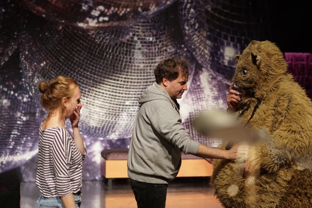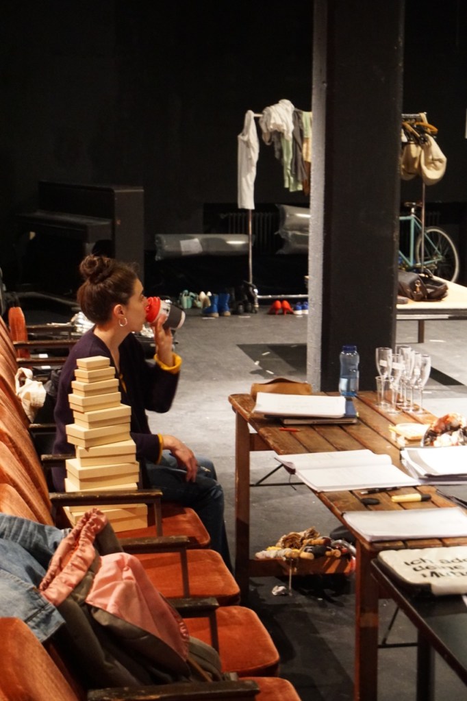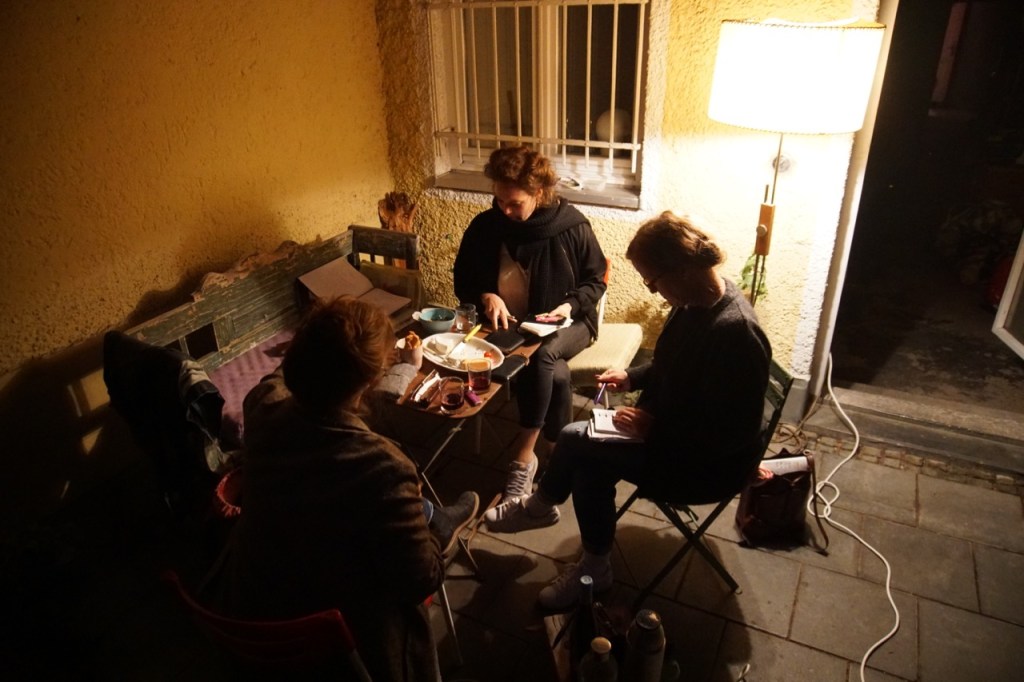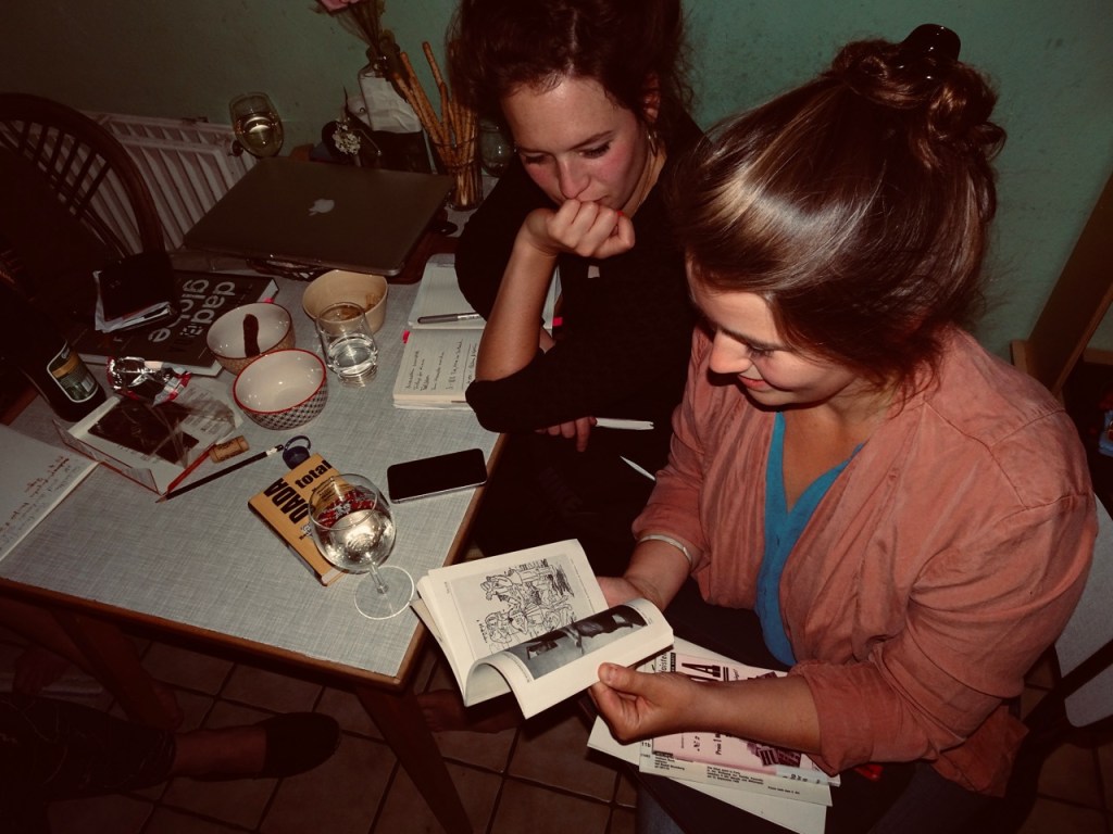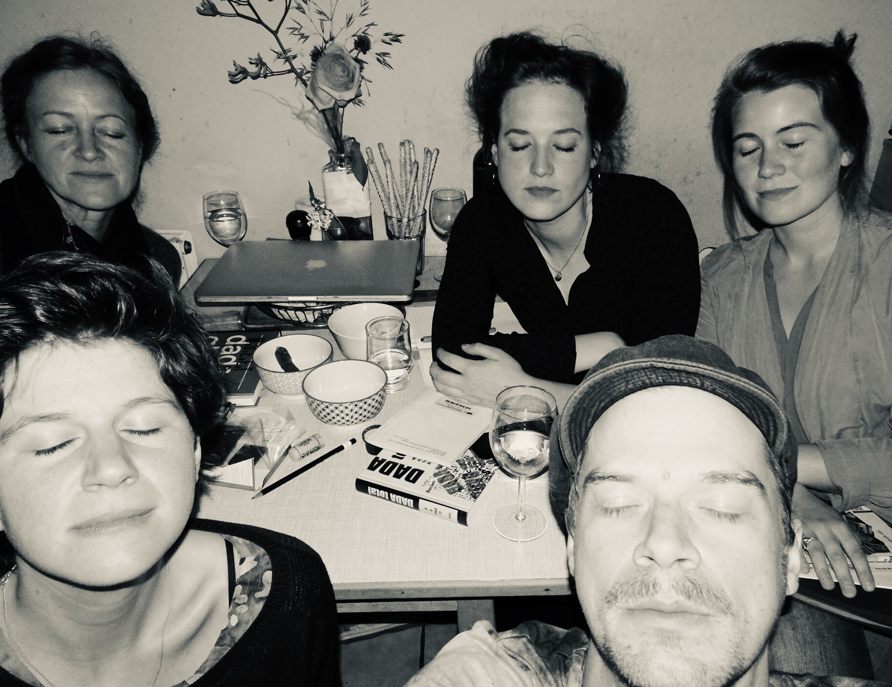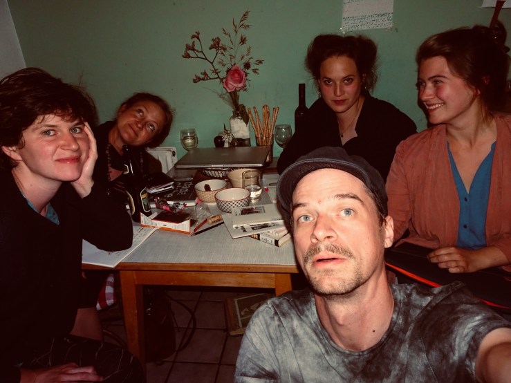 erste Arbeitstreffen (Tine Hagemann, Claudia Karpfinger, Katharina Schmidt, Arno Friedrich und Laura Mangels v.l.n.r.). Themen: Dada, Stücksetzung, Kostüm, Bühne, Figurenbau, Werbekampagne. Es geht los!